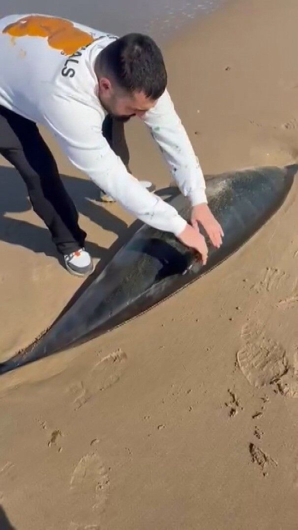 Dün Şile Sofular Sahili’nde yürüyüş yapan Bekir Yalçın, kıyıya vurmuş haldeki bir yunusu fark etti. Yalçın, arkadaşıyla birlikte yunusu yeniden denize ulaştırmak için müdahalede bulundu ancak yunus balığı kurtarılamadı.